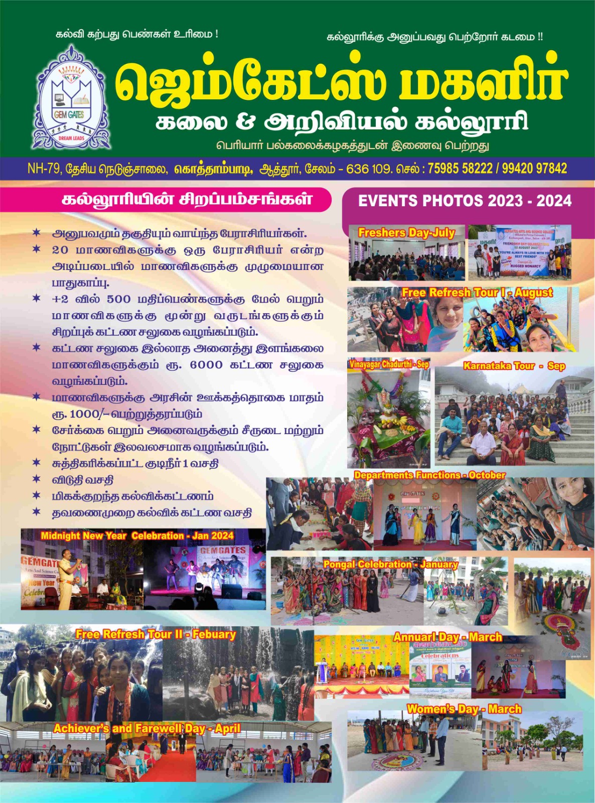 GGASC-Gem Gates Arts And Science College is affiliated with Periyar University and located in Salem, Tamil Nadu. The college was founded to achieve the aim of providing all the necessary facilities including quality education for students through research, training and advanced learning.